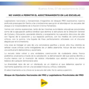 Asimismo el PRO mostró “su preocupación sobre cómo se está tratando el ataque a la Vicepresidente de la Nación Cristina Fernández en las escuelas “ y expresaron su profunda preocupación frente a las orientaciones que guían el abordaje en las escuelas” de este tema.
