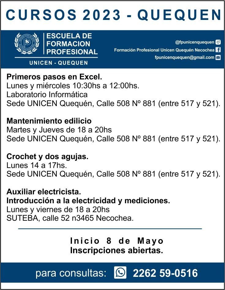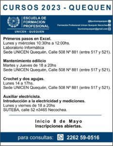 Los primeros cuatro cursos son: Auxiliar eléctricista, Mantenimiento edilicio, Primeros pasos en Excel y Crochet y dos agujas. Todos comienzan el próximo lunes 8 de Mayo y no son arancelados.
