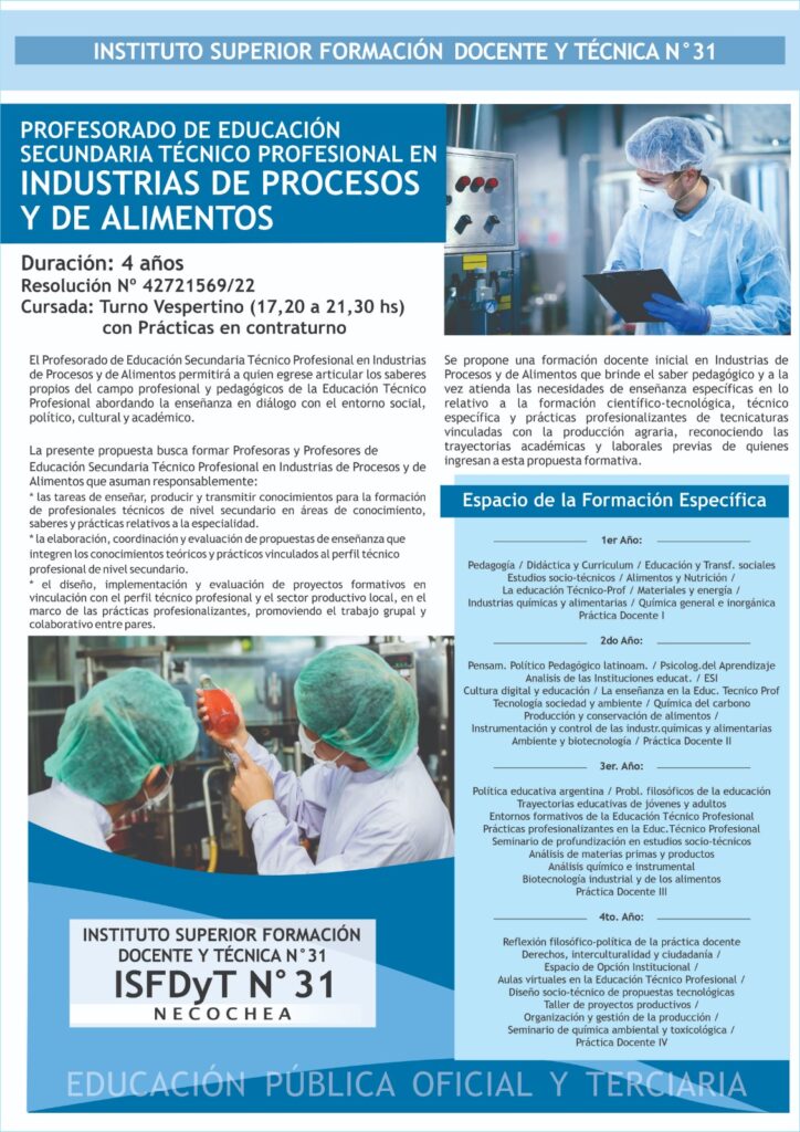 El Profesorado de Educación Secundaria Técnico Profesional en Industrias de Procesos y de Alimentos se suma a la oferta académica que el Instituto Superior de Formación Docente y Técnica N° 31 .