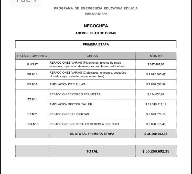 Ellas son la refacción de cubiertas (techos) para la EEST N° 2 Mariano Necochea por un valor de $8.023.078 y obras de refacción del cerco perimetral y ampliación del sector taller para EEST n1 Mario El puerto por un valor aproximado de $12.000.000.
