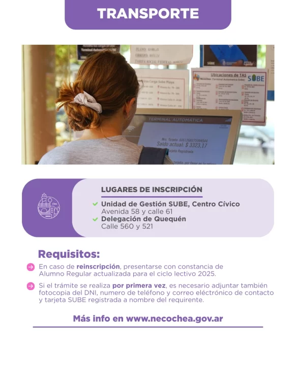 Por consiguiente, lo que finalizaba el pasado miércoles 16 de abril se extenderá hasta mañana viernes 25. Se recuerda que los estudiantes interesados en obtener el Boleto Estudiantil deberán presentarse en alguna de las Unidades SUBE (UGS) ubicadas en el Centro Cívico, 58 y 61; o en la Delegación Municipal de Quequén, en 521 y 560, en el horario de 8.30 a 13.30.