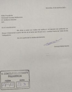 Así quedó de manifiesto en la nota que esta mañana envió al presidente del cuerpo, Guillermo Sánchez, informando sobre la novedad.