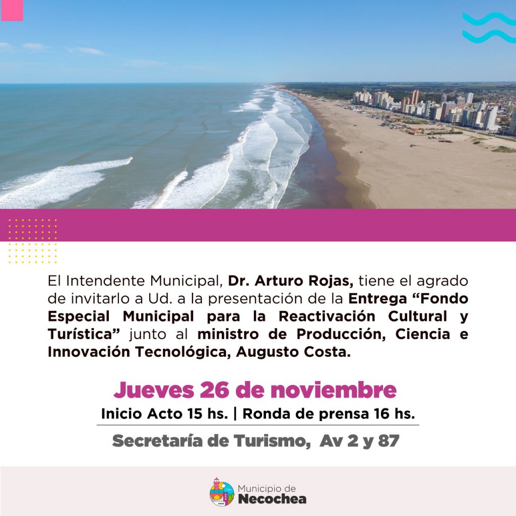 Según se anunció desde el municipio, el funcionario hará entrega del Fondo Especial Municipal para la Reactivación Cultural y Turística. El acto será encabezado por el intendente Arturo Rojas.