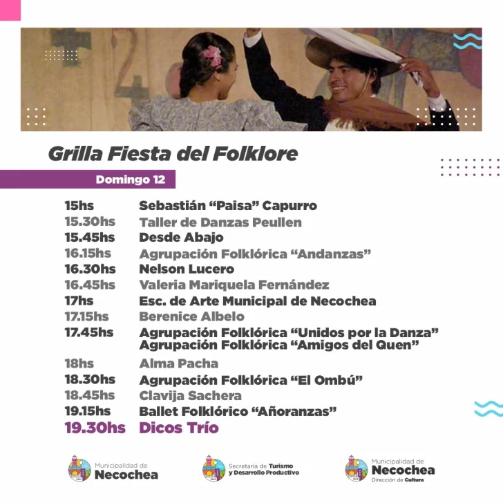 En cuanto a la jornada del domingo, el cierre de la fiesta estará a cargos de “Dicos Trío”, integrado por Emmanuel Villarruel, Ezequiel Villarruel y Juan Manuel Durán, quienes se definen como un espectáculo festivalero y bailable, “donde homenajeamos clásicos del cancionero popular argentino”.
