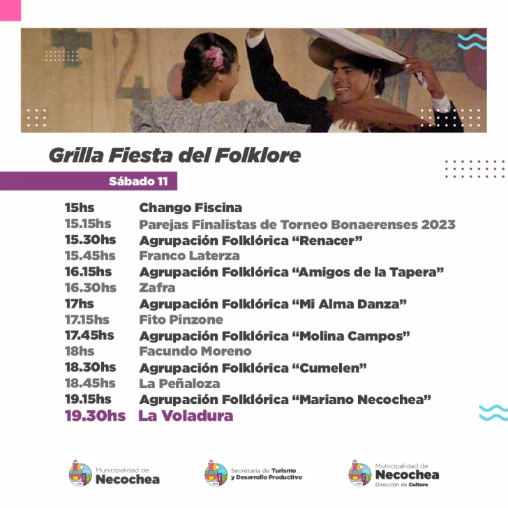 Si bien la fecha que se celebra a nivel nacional es el 10 de noviembre y este años cae viernes -Día de la Tradición y en homenaje al nacimiento del poeta José Hernández-, las actividades están planificadas para el sábado 11 y domingo 12, para lo que la Dirección de Cultura comunicó la grilla de espectáculos para ambas jornadas desde las 15, cuyos cierres estarán a cargo de los espectáculos foráneos “La Voladura” y “Dicos Trío, respectivamente.