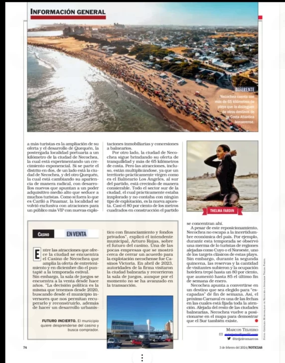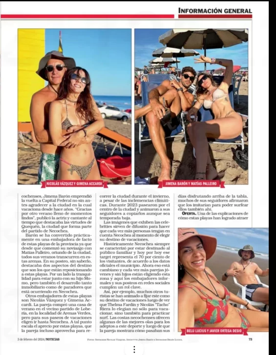 Dicha nota se encuentra en la edición de este fin de semana de la reconocida publicación. En la cual hay una nota de tres páginas destacando las bondades naturales, arquitectónicas y de infraestructura de Necochea y Quequén, además de ser un destino elegido por artistas influencers y famosos, entre ellos nombran a Belu Lucius, Jimena Barón, Nico Vázquez y Gimena Accardi, Tacho Riera y Thelma Fardín.