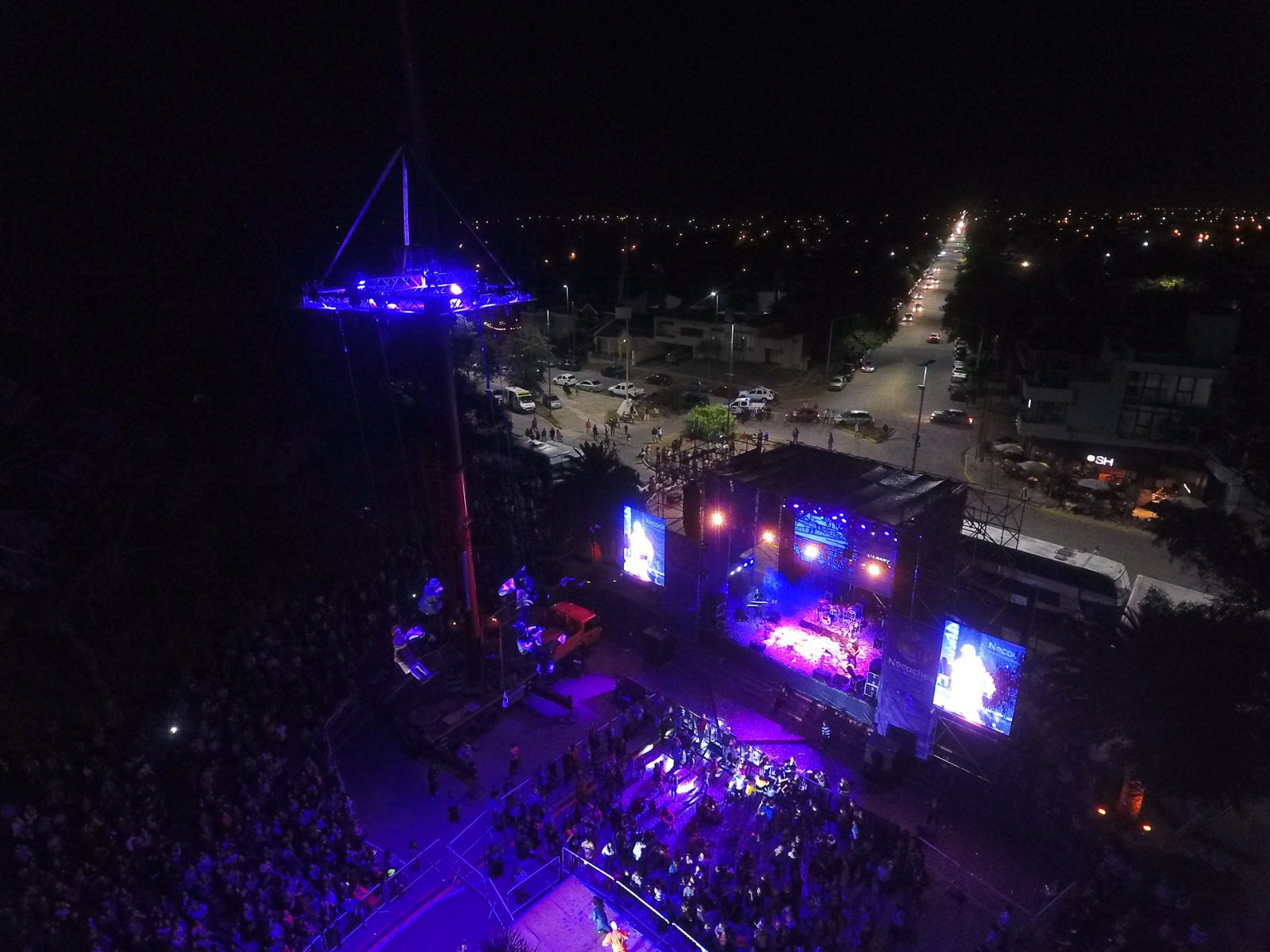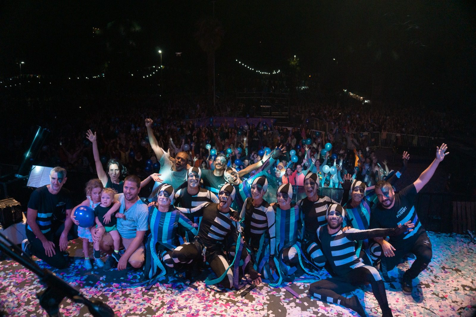 Las luces iluminaron el cielo, el sonido atmosférico empezó a subir sus decibeles y, por encima del escenario principal, colgados de una estructura que flotaba entre los árboles asomaron los primeros acróbatas de la Compañía PhaWay, mostrando a las miles de personas reunidas en el Festivalódromo el primer acto de su show “Célebre”.