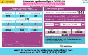 El parte de la Secretaría de Salud de este miércoles informa que se registraron 204 nuevos casos de coronavirus en el distrito más 26 personas que son consideradas positivas por criterio clínico. Se recuperaron de la enfermedad 320 pacientes, lo que hace un total de 1921 casos activos.