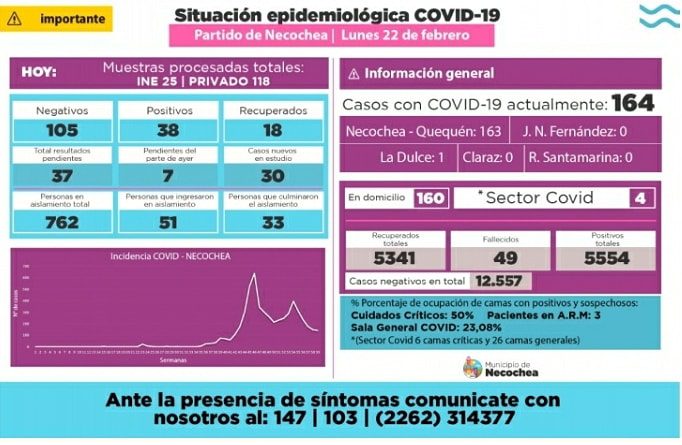 El parte de salud de esta tarde señala que de 143 muestras que se procesaron entre el INE y los laboratorios privados, 38 dieron resultado positivo y se recuperaron 18 pacientes haciendo un total de 164 casos activos en todo el distrito.