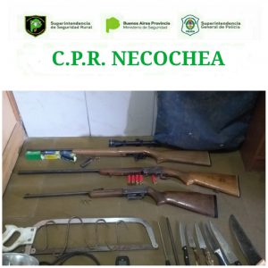 Una investigación por los recientes robos de ganado en la zona norte del partido de Necochea dio lugar a dos allanamientos en la localidad de Juan N Fernández, oportunidad en la que se incautaron armas largas, cuchillos y demás elementos que se utilizan en la práctica de abigeato.