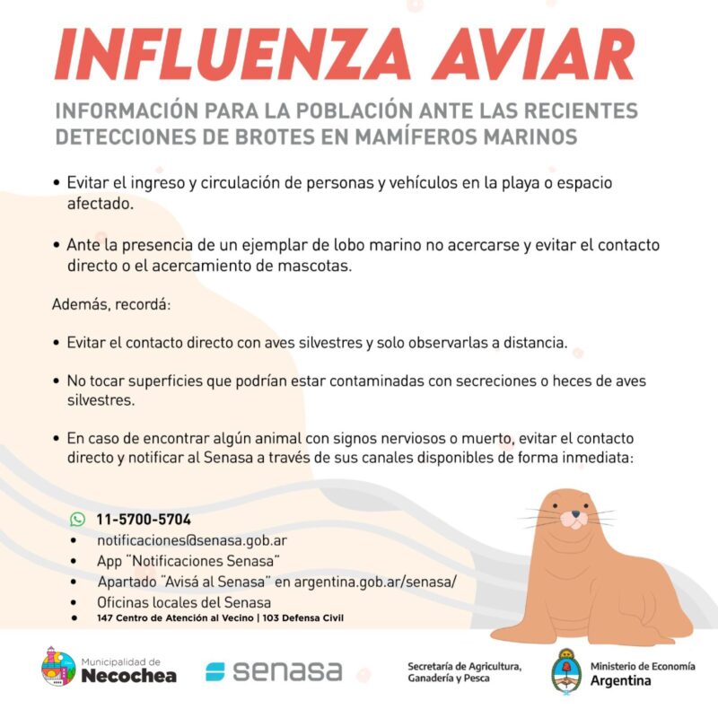 -La influenza aviar es una enfermedad de declaración obligatoria en nuestro país, según la Resolución 153/21 de la entidad, y cualquier persona puede notificar ante el organismo en caso de identificar mortandad, signos nerviosos, digestivos y/o respiratorios en aves silvestres o de corral, o en los ejemplares de lobos marinos, en este caso, a través de los siguientes canales: concurriendo personalmente a la oficina del Senasa más cercana (calle 520 N° 380, Quequén); llamar al teléfono 11 5700 5704; descargar la App para dispositivos móviles “Notificaciones Senasa”, disponible en Play Store; escribir al correo electrónico notificaciones@senasa.gob.ar; o por medio del apartado “Avisá al Senasa”, disponible en la página web www.argentina.gob.ar/senasa.