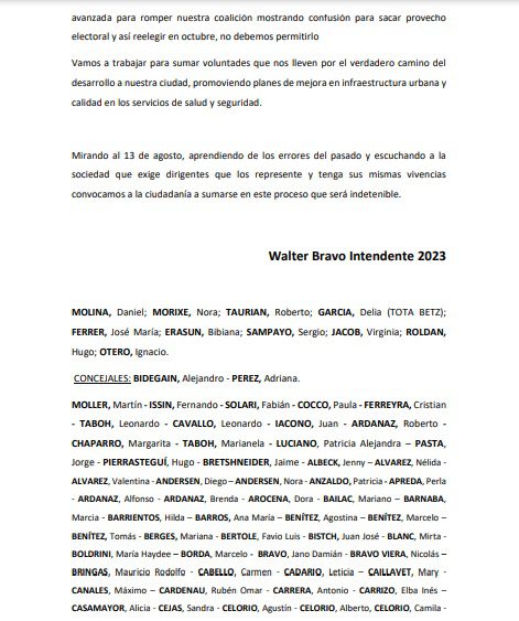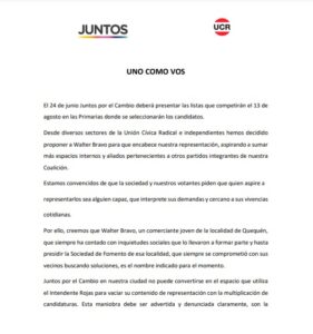 El comunicado que acompaña las firmas se denomina “Uno como Vos” e indica lo siguiente: “El 24 de junio Juntos por el Cambio deberá presentar las listas que competirán el 13 de agosto en las Primarias donde se seleccionarán los candidatos.