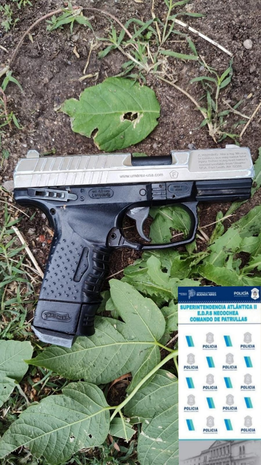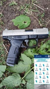 En la búsqueda, hallan escondida entre unos arbustos de calle 26 y 55, una réplica de pistola 9mm de color gris y negra, que había sido descartada durante la huida por el sujeto.