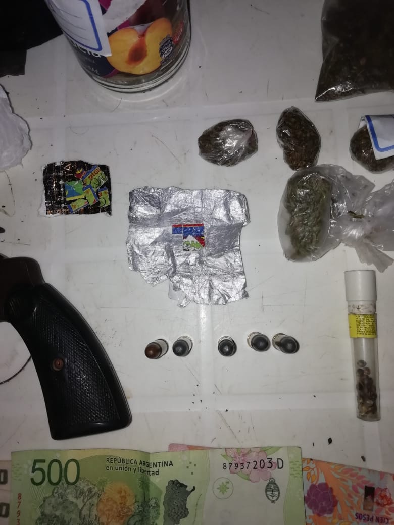 En el lugar fue aprehendido Nahuel Edén, secuestrándose aproximadamente 90 dosis de LSD, marihuana, cocaína y elementos para su fraccionamiento, además de un arma de fuego, un revólver calibre 32 con su correspondiente carga y con numeración suprimida, informó la Policía a TSN.