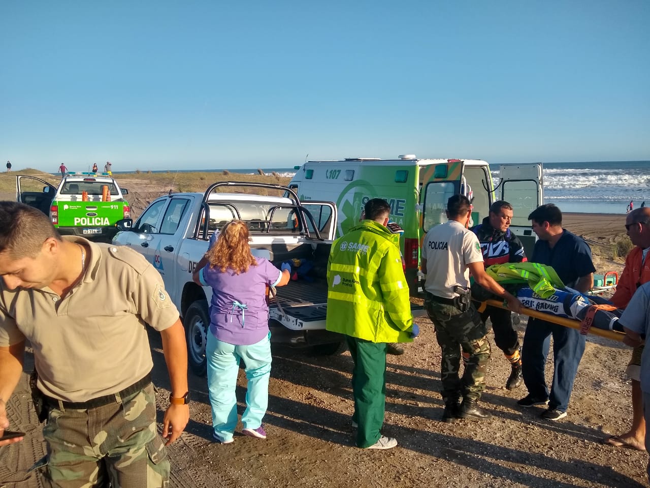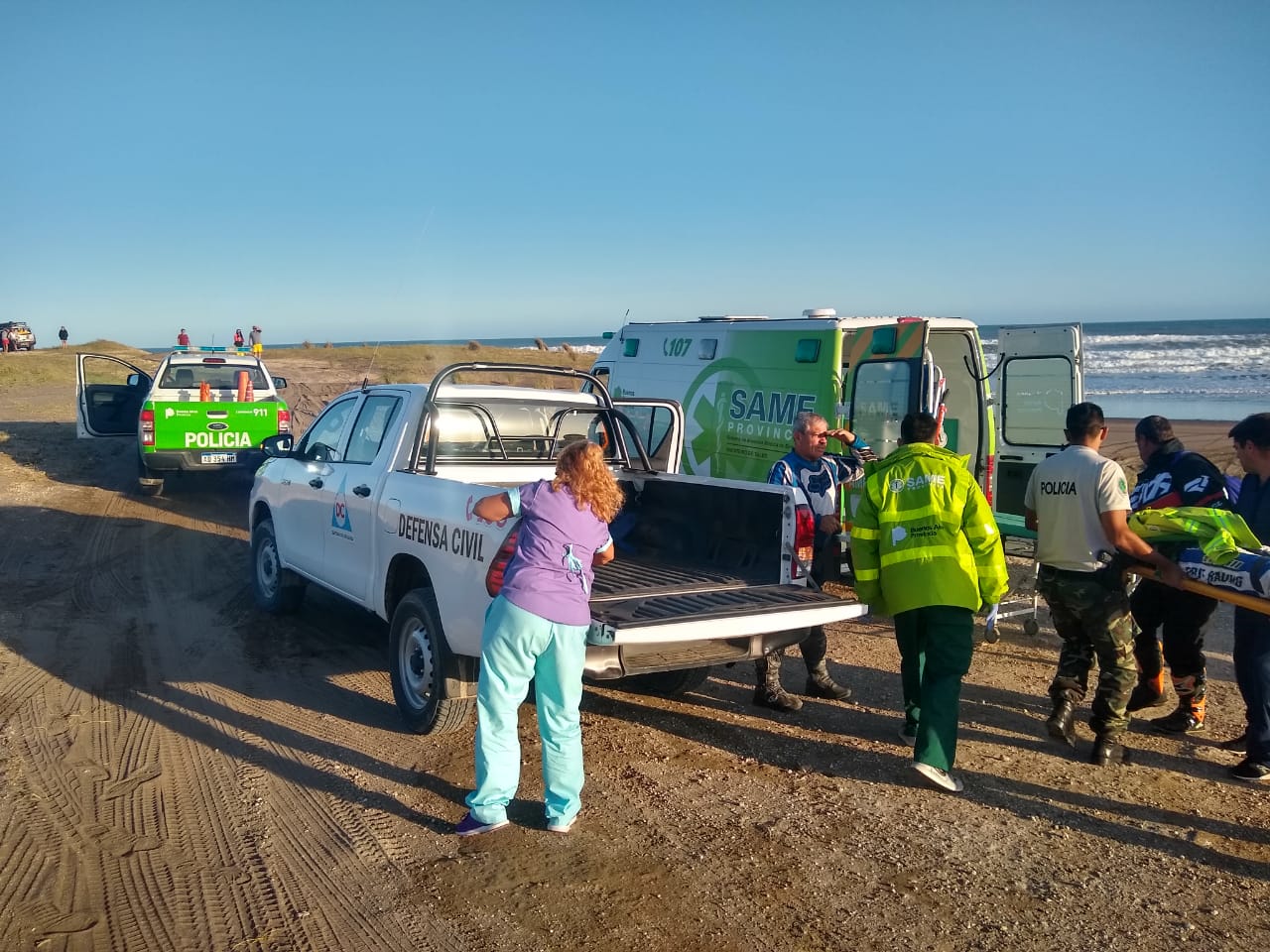 Una vez recibido el llamado proveniente de la operadora del Hospital Municipal Dr. Emilio Ferreyra, Defensa Civil puso en marcha un nuevo protocolo de rescate para ir en búsqueda de un motociclista que había sufrido un accidente en la arena minutos antes.