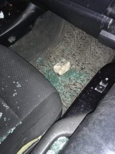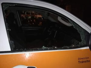 Ocurrió en la madrugada de este jueves cuando los trabajadores dejaron el móvil para ir hasta el baño y al volver encontraron que uno de los vidrios laterales había sido destruido por un piedrazo que quedó en el interior del vehículo.