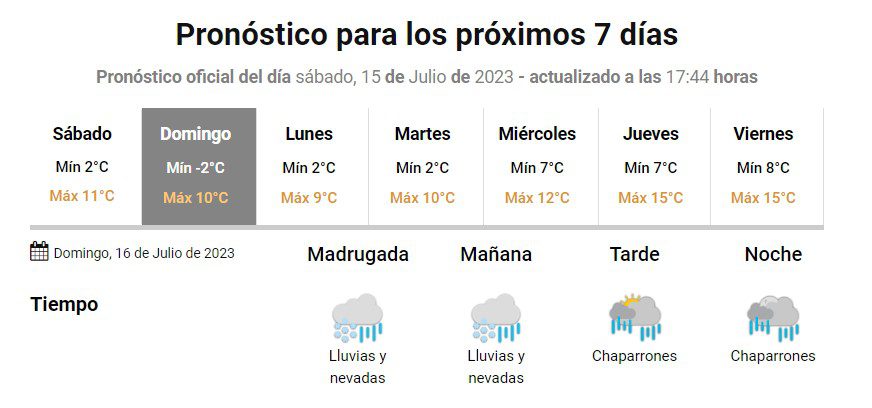 Según el organismo se prevé una mínima de 2 grados bajo cero lo que posibilitaría la llegada de la nieve durante la madrugada e incluso la mañana. Para el resto del día se anticipan lluvias.