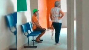 El video dura solo unos 17 segundos y se puede ver al hombre con el barbijo puesto, atado en una silla de color azul y una cuerda que rodea sus brazos. La mujer permanece parada, sosteniendo la soga.