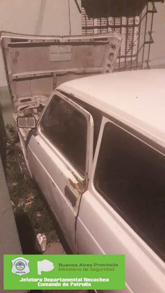 Según se informó desde el Comando de Patrullas, al ver la presencia de los efectivos sale corriendo y deja el automóvil, de color blanco, patente VYH – 502, con el parante de la puerta violentada del lado del conductor, el capot abierto y la batería retirada de su lugar correspondiente.