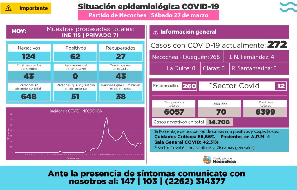Este sábado se produjo un aumento de positivos de coronavirus, habiéndose detectado 62 casos, según el parte que emitió la Secretaría de Salud. De esta manera, la situación epidemiológica de Necochea se asemeja a lo que sucede a nivel nacional, que desde los últimos días registra una suba de contagios.