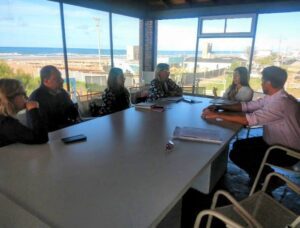 A raíz de esto, Matías Sierra, encabezó una reunión junto a la directora de Desarrollo Comercial, Industrial y Agropecuario, Rocío Zabaljáuregui, la directora de Legal y Técnica, Cintia Febbraro, el director de la Escuela Secundaria N° 13 de Quequén, Paulo Martín, la vicedirectora de la Escuela Secundaria N° 5, Cecilia Dindart, y la profesora y licenciada en Turismo, Ayelén Dyeni.