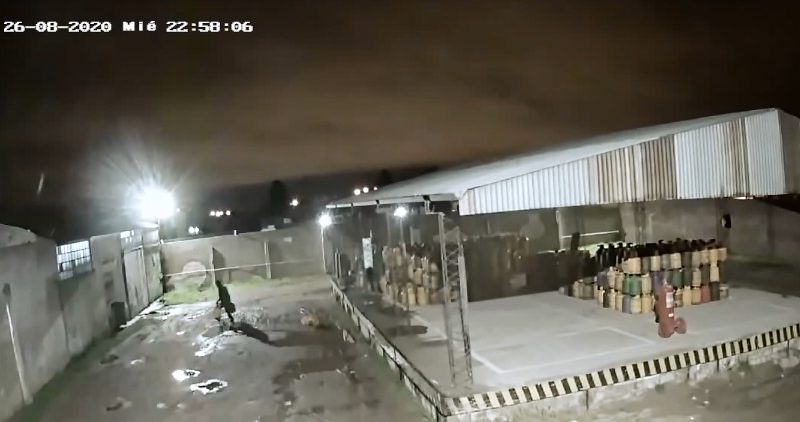El accionar sucedió a las 22,57 de este miércoles de acuerdo al registro fílmico del sistema de monitoreo. La imagen detectó el momento en que uno de los delincuentes egresa del depósito y se dirige a dicha plataforma en la que comienza a apoderarse de las garrafas.