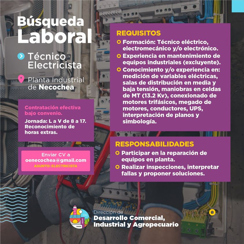 Los interesados deberán mandar un correo electrónico con su Currículum Vitae, escribiendo en el asunto del mensaje “Electricista”, al mail oenecochea@gmail.com.