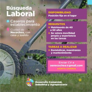 La primera de las búsquedas apunta a un matrimonio de entre 40 y 50 años de edad para establecerse como caseros, para cuyo objetivo se precisa disponibilidad fija en el lugar.