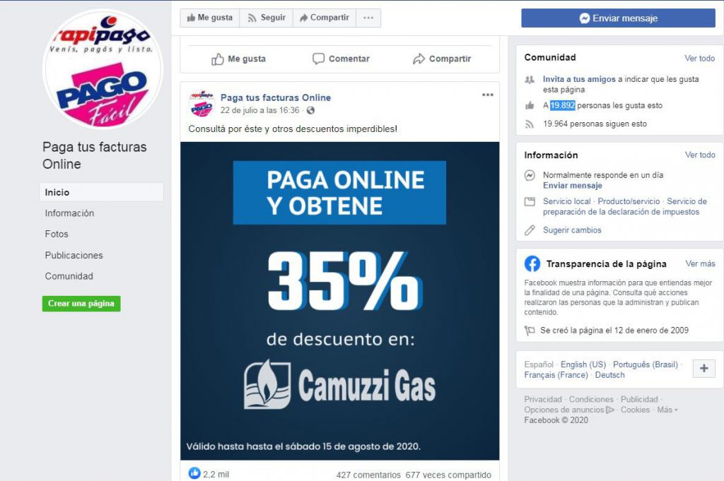 La página, que tiene más de 19.800 seguidores, asegura ofrecer un 35% de descuento en el pago mediante la propia fans page.