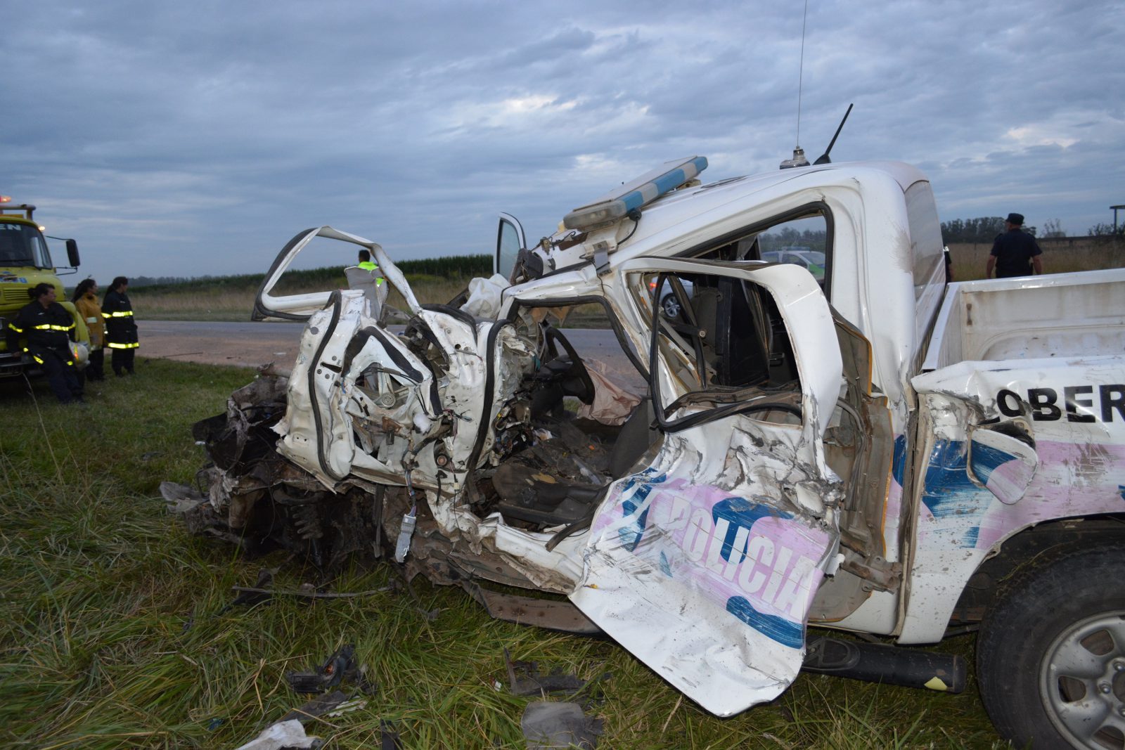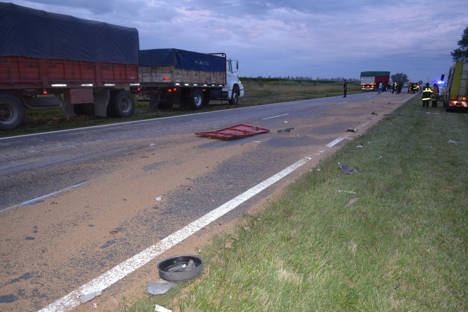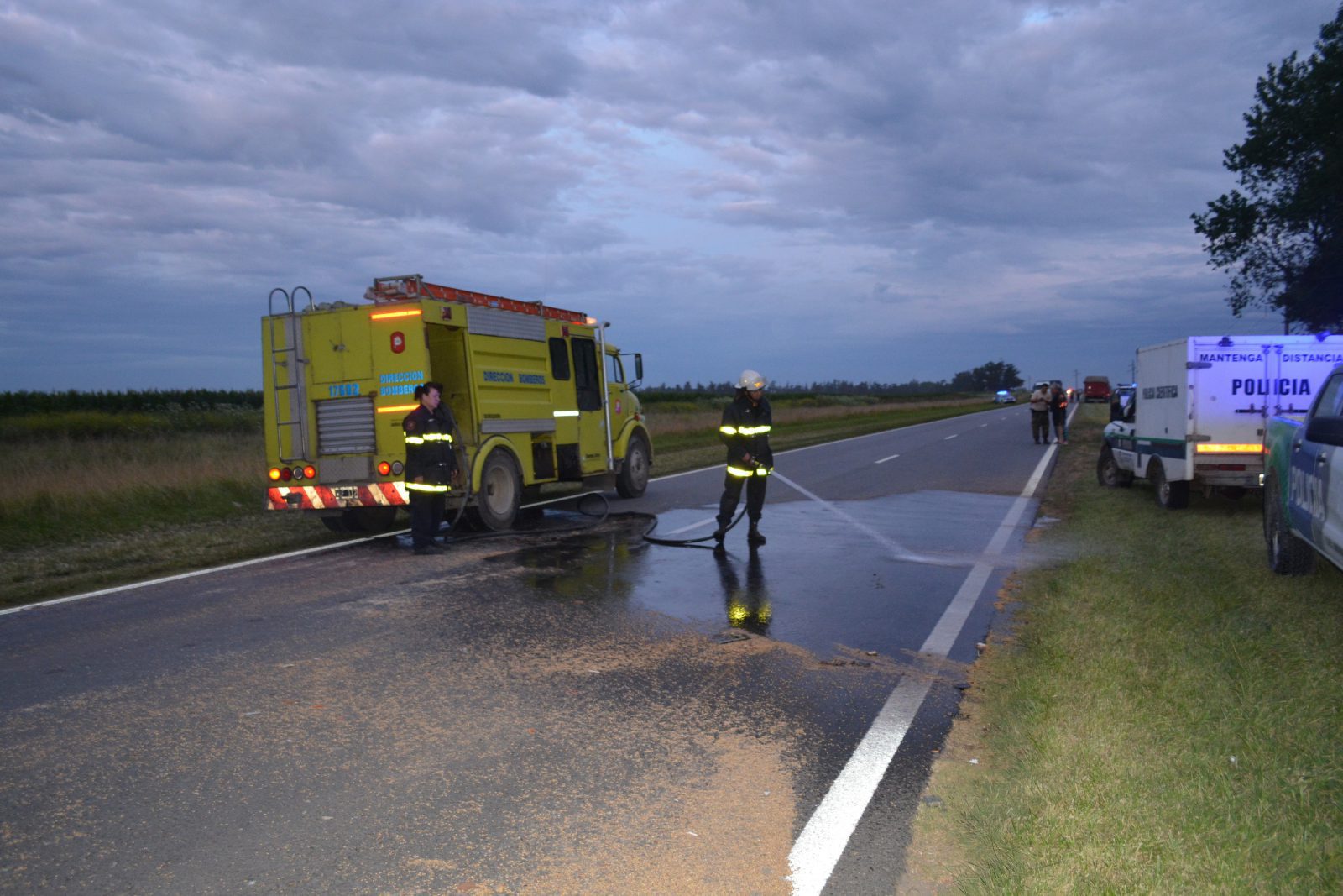Intervino Policía Vial en este siniestro con saldo fatal además de trabajar en el lugar personal de Bomberos, Policía Rural y Policía Científica limpiando la calzada del cereal y combustible derramados y tomando los peritajes correspondientes.