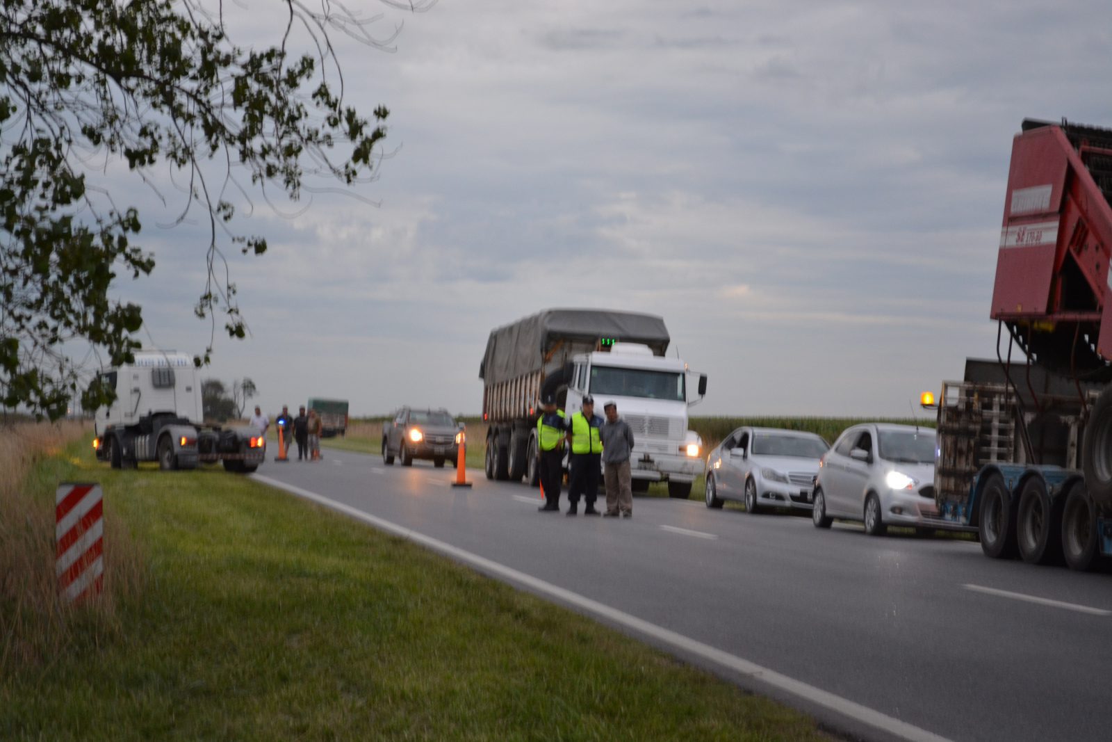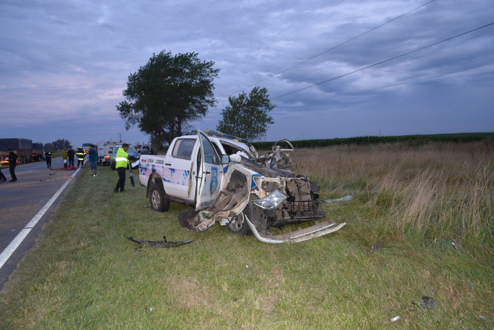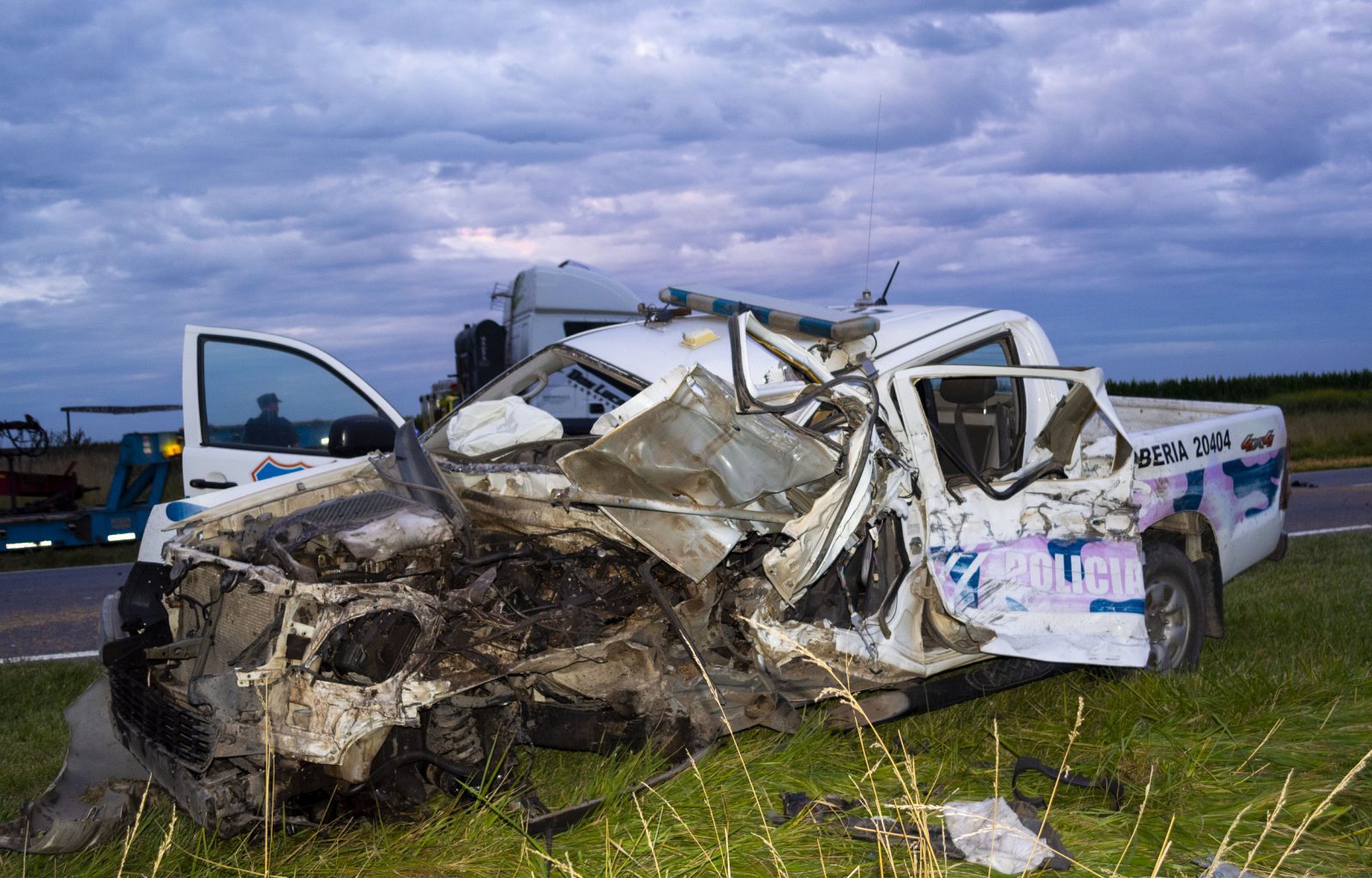 Intervino Policía Vial en este siniestro con saldo fatal además de trabajar en el lugar personal de Bomberos, Policía Rural y Policía Científica limpiando la calzada del cereal y combustible derramados y tomando los peritajes correspondientes.