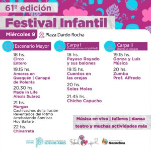 En el escenario a las 18 se presentará Circo Entero para dar paso a las 19:15 a la obra Amores en Quequén/Canapé de Polenta. En tanto que 20:30 saltará a escena Made In Life, cuya interpretación estará a cargo de Alexis Suarez. A las 21, será el turno de las Murgas, como son Cachivache de la Ilusión, Reventados del Ritmo, Arrebatando Sonrisas y Hoy Bailaré, para poner punto final, a las 22, la presencia de Chivarreta.