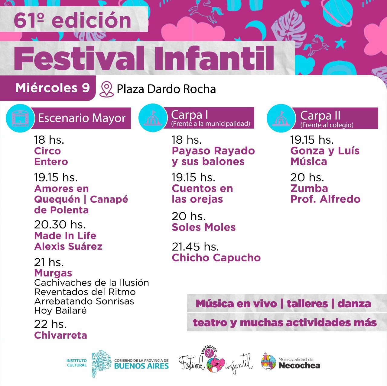 En el escenario a las 18 se presentará Circo Entero para dar paso a las 19:15 a la obra Amores en Quequén/Canapé de Polenta. En tanto que 20:30 saltará a escena Made In Life, cuya interpretación estará a cargo de Alexis Suarez. A las 21, será el turno de las Murgas, como son Cachivache de la Ilusión, Reventados del Ritmo, Arrebatando Sonrisas y Hoy Bailaré, para poner punto final, a las 22, la presencia de Chivarreta.