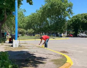 Se juntaron de la plaza del centro y, con la ayuda de vecinos que también se sumaron a la iniciativa, limpiaron y pintaron los cordones de la plaza Dardo Rocha.