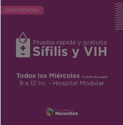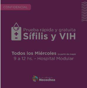 A partir de mayo, todos los miércoles, en el horario de 9 a 12, en el Hospital Modular, se estarán realizando pruebas rápidas de detección de Sífilis y VIH.