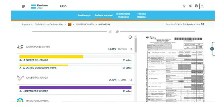 A través de la web oficial podés ver los telegramas y conocer el resultado del lugar donde votaste y también seguir el recuento preliminar de los votos, donde mostró a Javier Milei de la Libertad Avanza como el candidato más votado de este domingo 13 de agosto en todo el país.