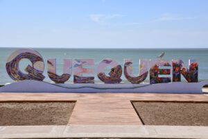Una gaviota moldeada en acero inoxidable cumple la función de tilde para acentuar la palabra Quequén, con La pieza es una verdadera ave posada sobre las estructuras de hormigón, otorgando un tinte aún más pintoresco al trabajo.