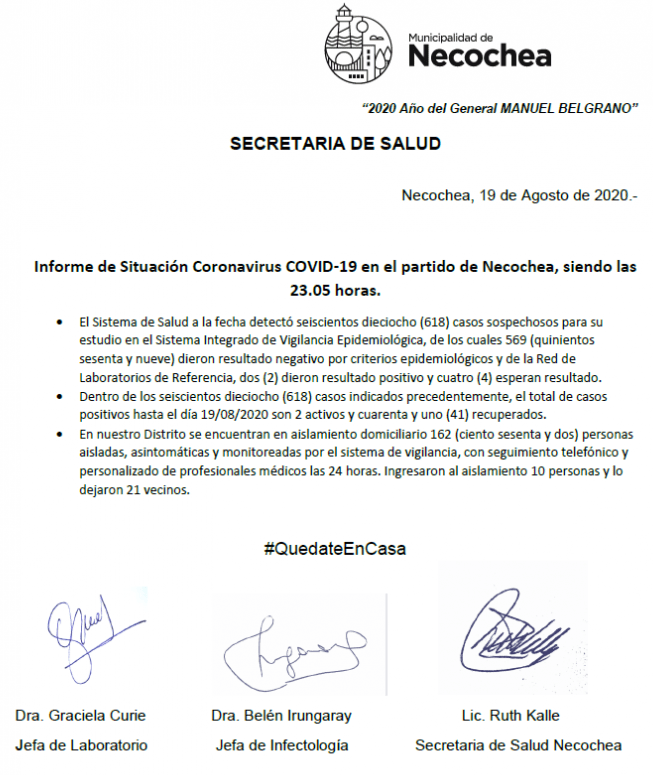 • Dentro de los seiscientos dieciocho (618) casos indicados precedentemente, el total de casos positivos hasta el día 19/08/2020 son 2 activos y cuarenta y uno (41) recuperados. En nuestro Distrito se encuentran en aislamiento domiciliario 162 (ciento sesenta y dos) personas aisladas, asintomáticas y monitoreadas por el sistema de vigilancia, con seguimiento telefónico y personalizado de profesionales médicos las 24 horas. Ingresaron al aislamiento 10 personas y lo dejaron 21 vecinos”.