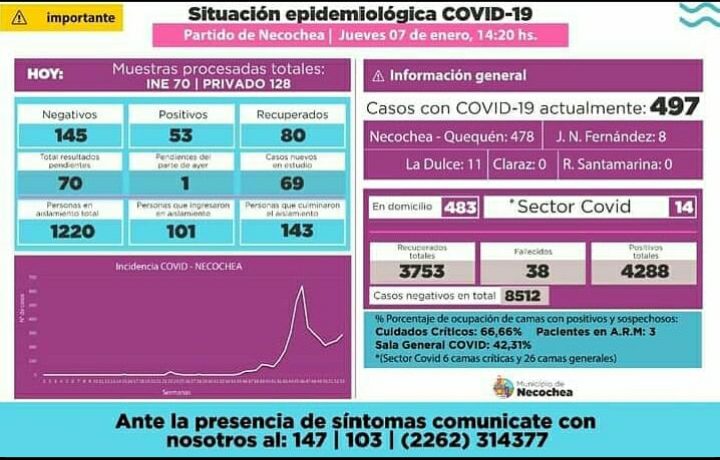 El parte de salud de este jueves, señala que se registraron 53 nuevos casos de Covid-19 en Necochea y Quequén, 80 pacientes recibieron el alta, con lo cual son 497 los casos activos.