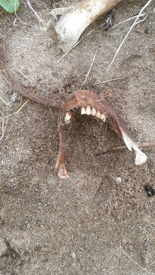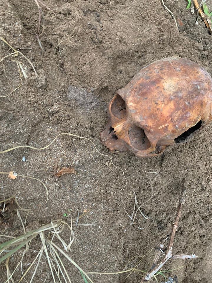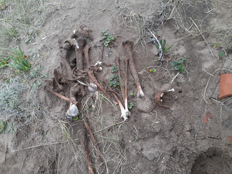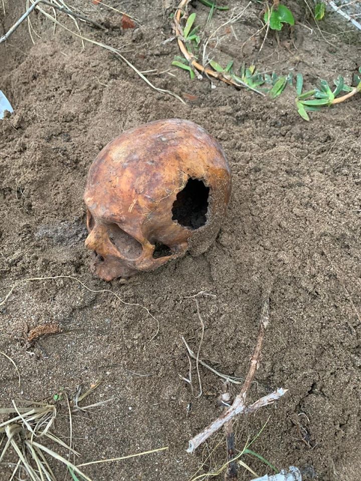 Un cráneo con un faltante en una de sus sienes, la izquierda, además de otras piezas óseas, en apariencia humanas como dos fémur, una mandíbula con parte de sus piezas dentales, restos de la cadera y otros huesos fueron hallados en el atardecer de este domingo en cercanías a una vivienda lindera con el mar justo en el ingreso y egreso al balneario.