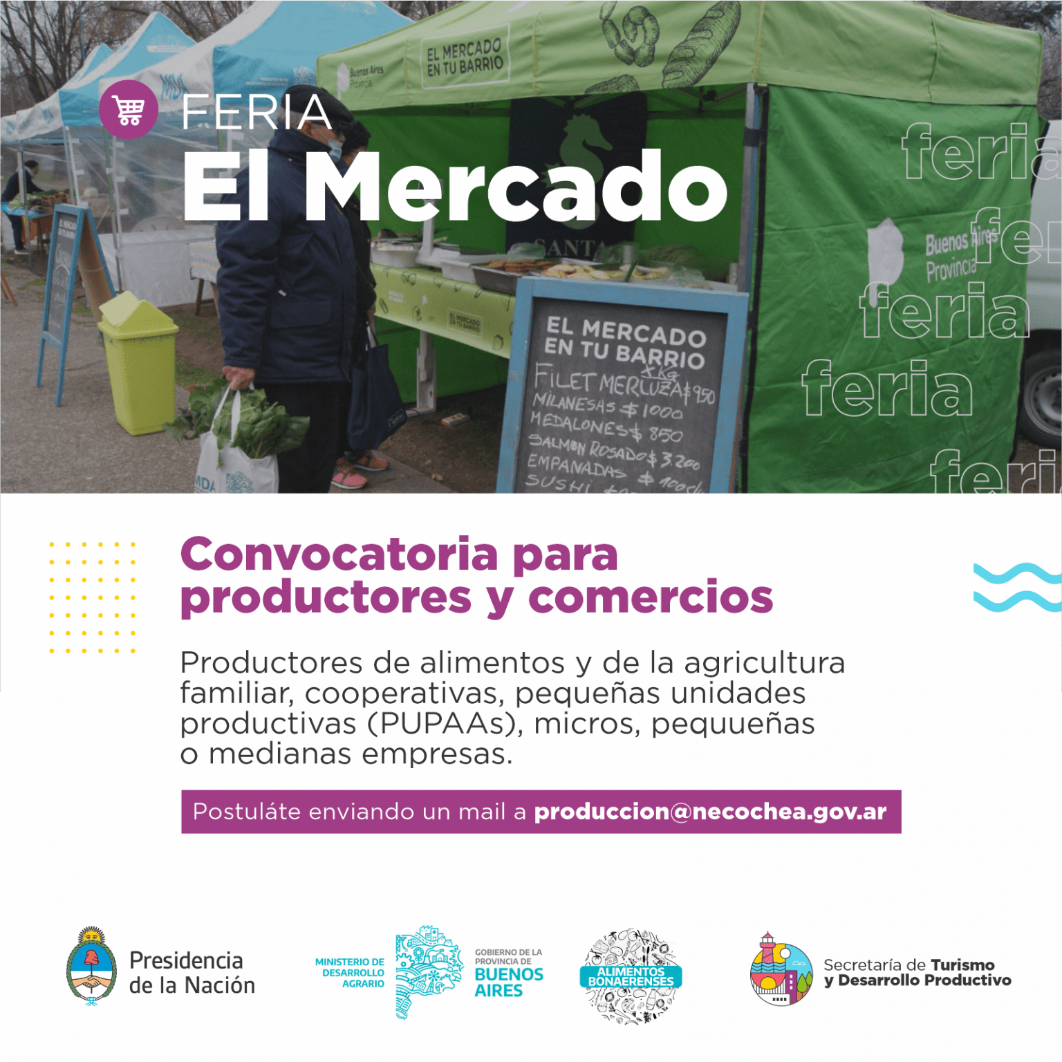 Los interesados deberán enviar un correo electrónico a la casilla produccion@necochea.gov.ar, en el que se especifique el rubro al que se dedican con un listado adjunto de productos y precios estimados, constancia de Habilitación Comercial o PUPAA, constancia de inscripción en AFIP y fotocopia del DNI.