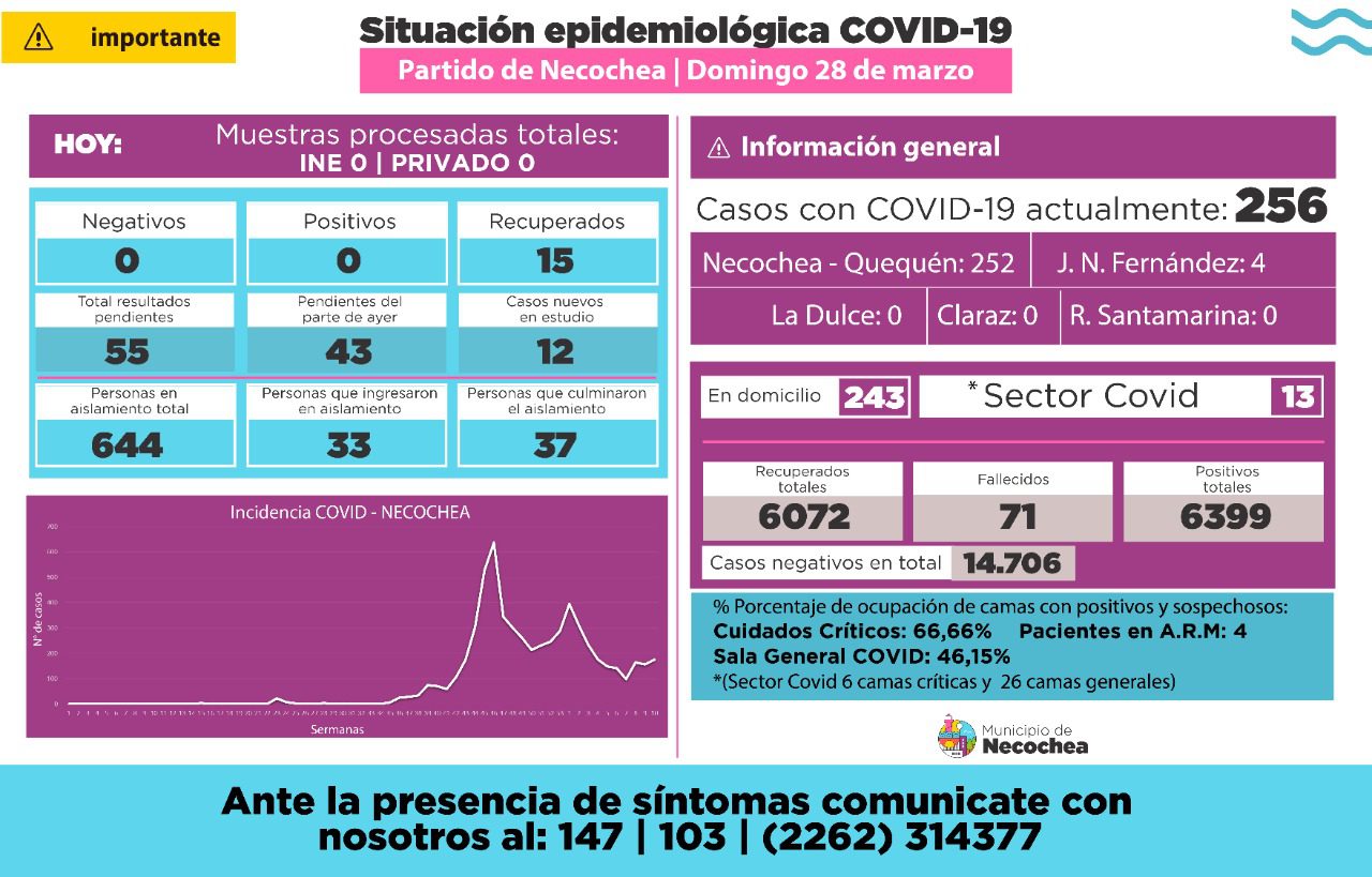 Un nuevo fallecimiento, producido este domingo, se suma a la lista de víctimas fatales de coronavirus, que en el distrito de Necochea asciende a 71 personas. Así se desprende del informe diario de la Secretaría de Salud, que en la presente jornada no reportó nuevos casos al no haberse procesado muestras por parte del Instituto Nacional de Epidemiología y laboratorios privados.