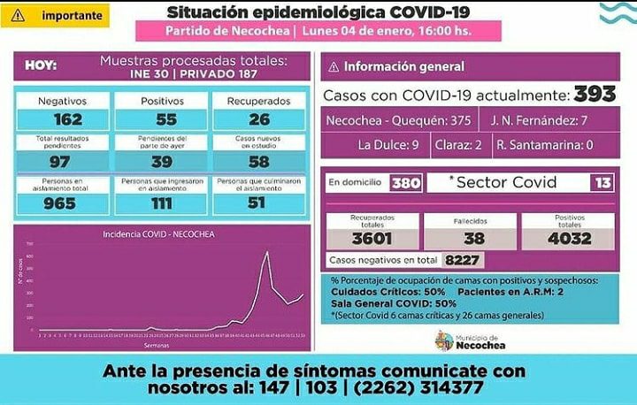 El parte diario informó que en la presente jornada se procesaron 217 muestras, de las cuales 162 arrojaron resultado negativo y se recuperaron de la enfermedad 26 pacientes. Desde los últimos dos días el número de víctimas fatales se mantiene en 38, señala el informe.