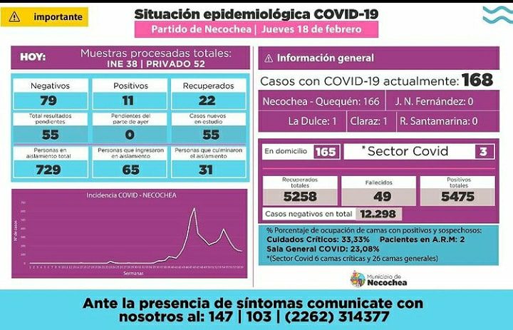79 muestras dieron resultado negativo y 22 pacientes se recuperaron , haciendo un total de 168 casos activos en todo el distrito.