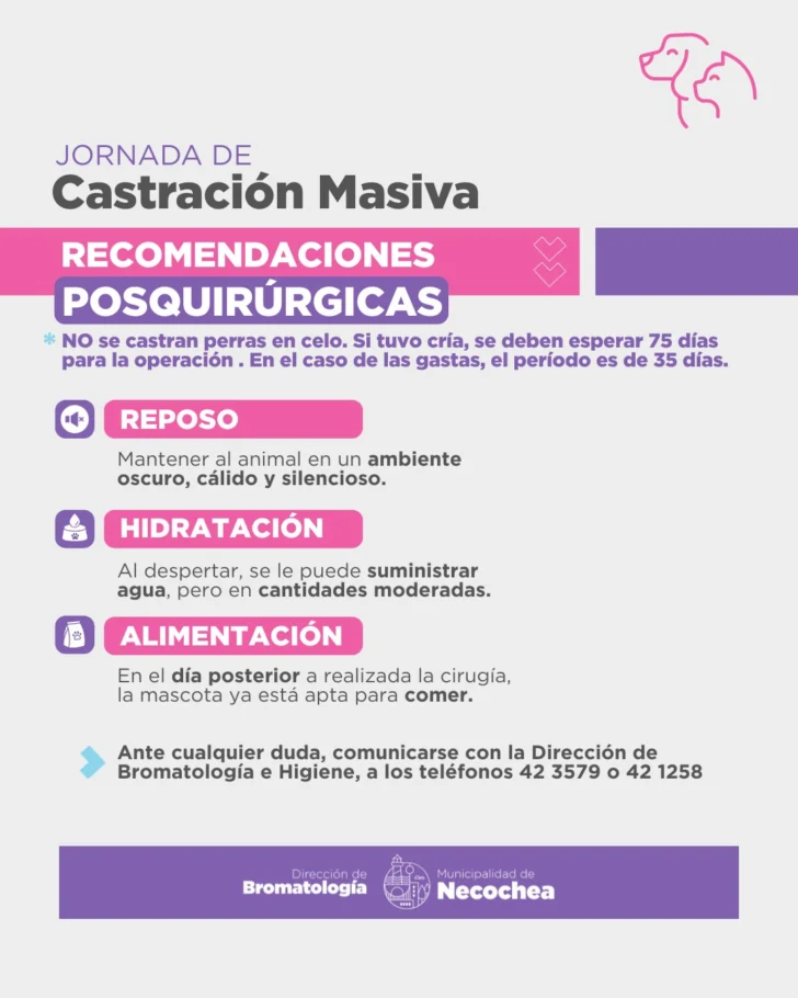 La Municipalidad de Necochea, a través de la Dirección de Bromatología e Higiene, informa que el próximo sábado 11 de abril se llevará a cabo una nueva jornada de castración masiva de mascotas, en el marco de las políticas públicas destinadas a promover la tenencia responsable.