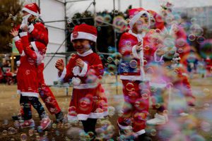 Práctica de natación invernal, a 6 grados bajo cero y disfrazados de Papá Noel en Shenyang, ChinaUn buzo vestido como Papá Noel nada con peces y un tiburón ballena en un acuario del Yokohama Hakkeijima Sea Paradise, en JapónVestido como Papá Noel, un elefante participa de las celebraciones de Navidad en Ayutthaya, TailandiaUn hombre haitiano disfrazado de Papá Noel participa de un desfile navideño en Petion Ville, en la capital haitiana de Puerto PrincipeUn improvisado árbol de Navidad con bandera Norteamericana en el refugio temporla de migrantes, en Baja California, MéxicoUn árbol de Navidad en la plaza Al-Azizzieh, en Aleppo, noroeste de SiriaLas dos caras de los festejos; una juguetería y al lado, un bombardeo, en SiriaLa gente vestida como Papá Noel baila y se prepara para la carrera anual de la ciudad de Skopje, MacedoniaRemeros de pie vestidos como Papá Noel, renos y un ángel, cruzan el rió Neckar en Heildelberg, en el suroeste de AlemaniaLos fieles cristianos armenios oran dentro de la Gruta, el lugar donde se cree que nació Jesucristo, en CisjordaniaEn algunos lugares, como en el centro de Bakú, Azerbaijan, ya se preparan para año nuevo como en Maiden TowerLos chefs aplican los toques finales a un pastel de ciruelas navideñas de 17 metros de largo en un centro comercial en Ahmedabad, IndiaUn hombre vestido de Papá Noel pasea por las calles de JerusalénUna vista muestra la cúpula de la Iglesia de la Natividad en Belén, en la CisjordaniaNiños juegan con burbujas, en Tokio, JapónPapá Noel saluda desde un camión decorado con luces mientras se abre paso a través de la aldea de Cuxton, en Kent, Gran BretañaLos niños iraquíes caminan junto a una tienda que vende adornos navideños en Bagdad, IraqResidentes de Venecia navegan disfrazados por el Gran canal de Venecia, a bordo de las gondolasVoluntarios lanzan sus sombreros al aire mientras se reúnen para entregar regalos para los más vulnerables en el centro de Seúl, Corea del Sur
