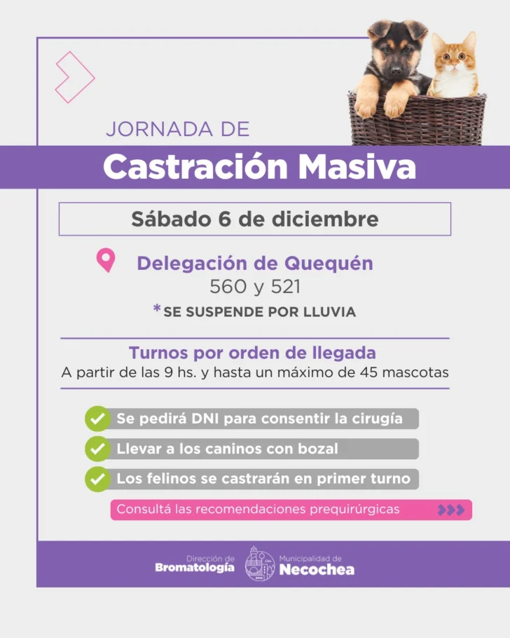 La Municipalidad de Necochea anuncia que este sábado 6 de diciembre se brindará una nueva jornada gratuita de castración masiva de mascotas, concentrándose en el sector de la Delegación Municipal de Quequén, en 560 y 521.