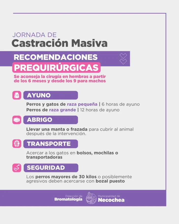 En cuanto a las recomendaciones prequirúrgicas, desde Bromatología se aconseja la cirugía en hembras a partir de los 6 meses y desde los 9 para los machos. Los perros y gatos de raza pequeña deberán tener 6 horas de ayuno y para los perros de raza grande se recomienda 12 horas de ayuno.