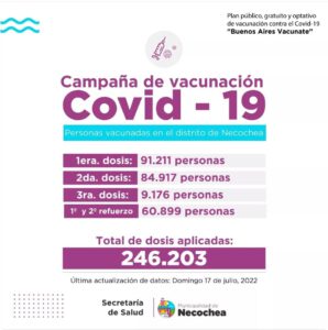 Continúa realizándose la vacunación contra el Covid-19 en el hospital modular. En el distrito se vacunaron 91211 personas con la primera dosis, 84917 con la segunda. En tanto que 9176 personas se aplicaron la tercera dosis y 60899 primera y segunda dosis de refuerzo.