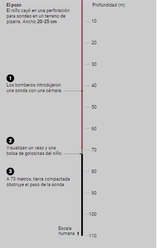 El problema es que todavía se desconoce la profundidad en la que está el niño de 2 años, ya que se ha conseguido llegar a 73 metros, aunque los últimos datos apuntan a que el pozo mide 107 metros. Por ahora, los equipos de rescate se han topado con un tapón de tierra que han conseguido perforar en 30 centímetros.